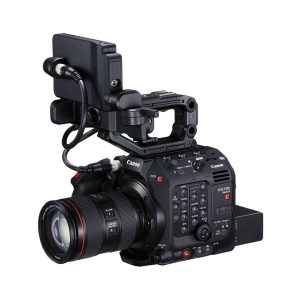 La videocamera dispone di un’uscita fino a 12G-SDI su un singolo cavo BNC, I/O timecode e ingresso genlock BNC. Canon EOS C300 Mark III supporta fino a 4 canali audio utilizzando il microfono interno, l’ingresso mini-mic e le porte XLR, e un’unità di espansione può essere aggiunta per supportare fino a quattro ingressi XLR. Il corpo ha un design modulare che può essere smontato completamente o costruito utilizzando la maniglia inclusa, un’unità LCD touchscreen rotante da 4,3″ con controlli completi, impugnatura e poggiapollice.